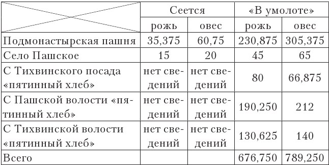 Выше были приведены данные об общих запасах хлеба в монастыре по переписи 1700 г. – 1870 четвертей (включая 10 четвертей ячменя). В том году на нужды армии в монастыре было взято 480 четвертей ржи и овса, то есть около четверти всех запасов. Сравнивая эти цифры со средним ежегодным «умолотом» 1702 г., по оценке житенного старца Иова (676,75 ржи и 789,25 овса, всего 1466 четвертей), можно заключить, что в начале Северной войны из Тихвинского монастыря был изъят весь запас хлеба, превышавший ежегодный «умолот».