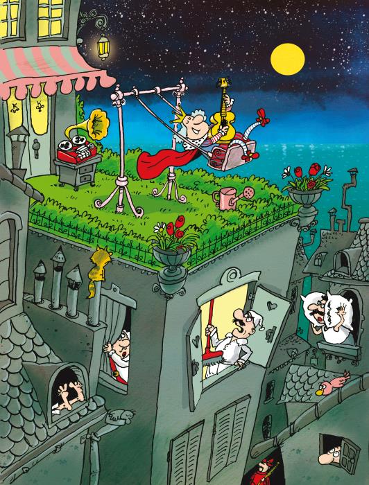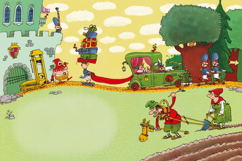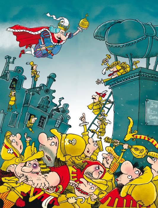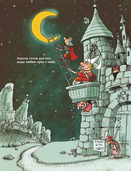 Вскоре король набрал высоту и посмотрел вниз на своё собственное родное королевство. И увидел, что весь его народ страдает, плачет, кричит, ругается или дерётся. И никто даже не смеётся, не пляшет и песен не поёт.