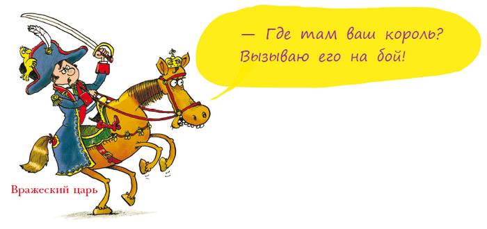 Пришло время решающего сражения. И вот выезжает на коне вражеский царь. Саблей размахивает и кричит: