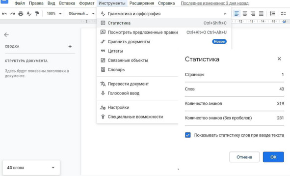 Для Google Docs – меню «Инструменты», подменю «Статистика». Чтобы настроить показ количества знаков/слов прямо в процессе набора, просто зайдите в «Статистику» и поставьте галочку напротив «Показывать статистику слов при вводе текста».