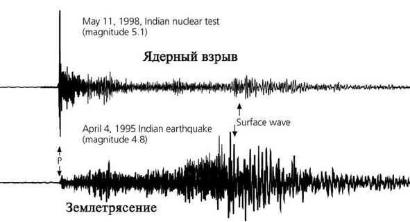 Сейсмограммы землетрясения (1995) магнитудой 5,1 и ядерного взрыва (1998) магнитудой 4,8 в Индии.