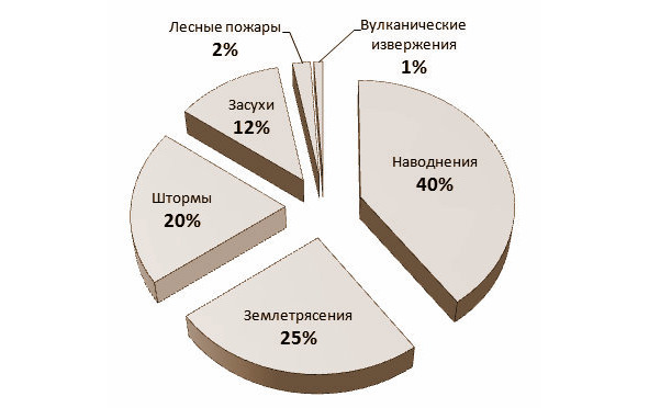 Распределение ущерба от природных катаклизмов в мире с 1900 по 2015 годы. За 115 лет 35 тысяч стихийных бедствий нанесли мировой экономике ущерб в семь триллионов долларов, и унесли более восьми миллионов человеческих жизней (по данным KIT, 2016).