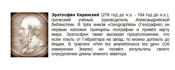 Путешествия за пределы привычного ареала обитания привели к необходимости систематизации знаний об окружающем мире и возникновению древнейших из наук – географии. Этот термин впервые использовал греческий ученый Эратосфен Киренский. Он же в 240 году до нашей эры определил длину экватора в 252 тысячи стадий или около 39690 километров с небольшим расхождением от современной оценки в 40120 километра. Эратосфен составил первую карту мира с учетом шарообразности Земли и с использованием меридиан и параллелей, назвав их «линиями, идущими рядом» и «полуденными линиями».