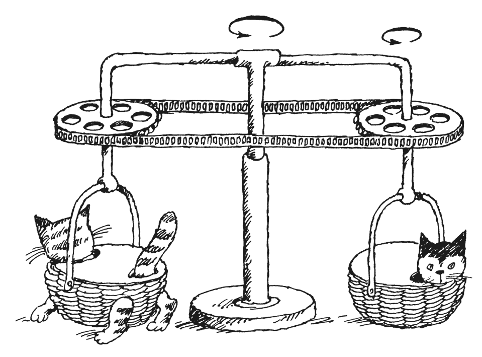 Новорожденные котята содержались в тем-ноте, а на свету находились только в специальном станке. Этот станок представлял собой подобие карусели с двумя корзинами для котят, каждая из которых могла двигаться вокруг трех осей: главной оси карусели, вертикальной и горизонтальной осей корзины. Для одного котенка в корзине были сделаны отверстия, в которые он просовывал лапки. Другой не мог производить никаких движений и перемещался пассивно – его возил первый. При этом обе корзины совершали одинаковые движения, поэтому зрительные впечатления котята получали одновременно и одинаковые. Однако позже выяснилось, что котенок, который не мог двигаться, так и не научился различать форму предметов, а у активного котенка никаких нарушений в зрительных восприятиях не было.