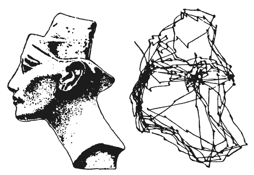 Закономерности в движениях глаз при осмотре объекта. Слева: фотография скульптурного портрета Нефертити; справа – траектория движения глаз при ее осмотре