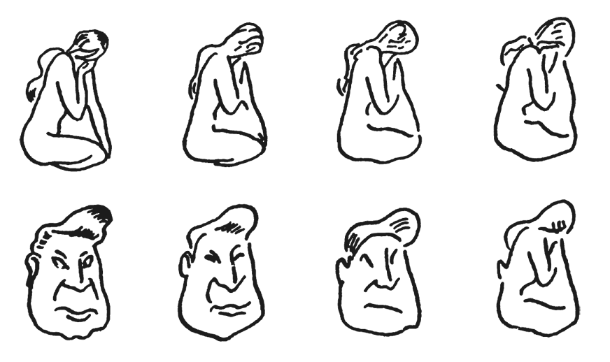 Посмотри на нижний рисунок. Если рассматривать изображения в верхнем ряду, двигаясь слева направо, то последнее воспринимается как фигура сидящей женщины. Если рассматривать изображения во втором ряду в том же порядке, то последнее воспринимается уже как лицо мужчины.