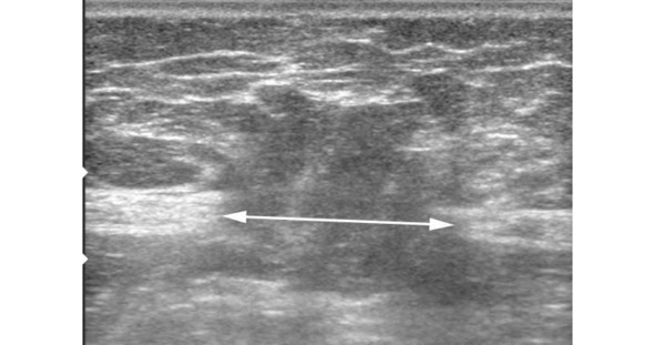 Рис. 32 Эхограмма передней брюшной стенки у больной с послеоперационной грыжей средней линии живота M2W1. Прямой линией со стрелками на концах отмечены грыжевые ворота