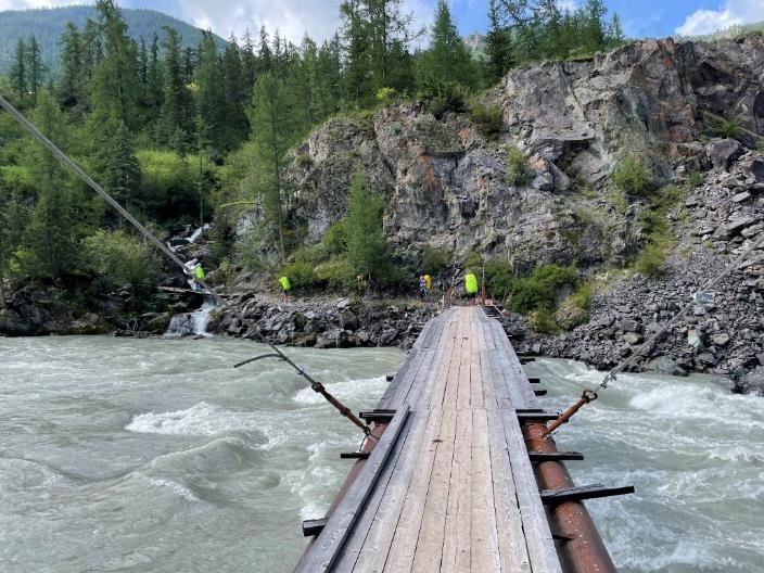 Нас разбили на небольшие группы, по очереди сажали на машины и перевозили на начало нашего пути. Мы оказались в предпоследней машине и ехали с Даней вообще вдвоем. Это был УАЗ Патриот, изрядно убитый на местных дорогах. Водитель включил Высоцкого «Если друг оказался вдруг», сентиментальная слеза поползла по моей щеке! Не доезжая до места назначения нас обогнал Крузак с Мишей и семьей Куликовых на борту))) Таким образом, по тропе мы шли последними, за Мишей. Мы спустились с горы резко вниз по тропинке и дошли до мостика через бурную реку Чую. Перил на мосту нет, и идти можно только по одному человеку, так как мост раскачивается при ходьбе. Выключаю страх, не смотрю по сторонам, а просто иду вперед за Даниным рюкзаком, маячившем впереди. Доползла на полусогнутых!