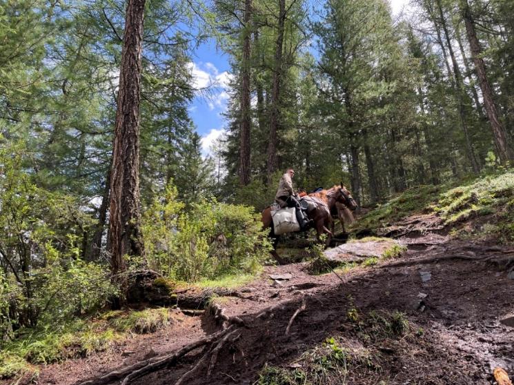 Тропа для людей и лошадей одна, поэтому она разбита вхлам)). Выбора нет, приходится карабкаться по ней, учитывая, что набор высоты в первый день 800 метров на протяжении 8 км- это люто)) Камни, корни, глина, перелезаем, цепляемся за корни, и при это резко вверх. Я внизу еще сомневалась, надевать ли гамаши? Надевать однозначно!!!!