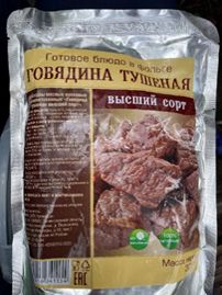 Вот такой тушняк из говяды хороший. Только сначала надо сделать этому пакетику «массаж»– размять очень хорошо пальцами все кусочки, чтобы не было больших кусков и всем попалось поровну. А то Миша ругается)