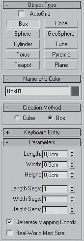 4. Раскройте свиток Keyboard Entry (Ввод с клавиатуры), введите в счетчики свитка, определяющие положение в сцене, размеры и другие настройки объекта, нужные значения и нажмите кнопку Create (Создать). При этом в указанном месте сцены будет создан объект с заданными параметрами.