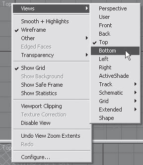 Если поработать в окнах проекций Тор (Вид сверху), Front (Вид спереди) или Left (Вид слева) инструментом Arc Rotate (Поворот проекции), можно заметить, что название окна изменилось на User (Пользовательский вид). Чтобы вернуть окнам проекций первоначальный вид и название, нужно активизировать окно и нажать клавишу, соответствующую первой букве названия окна проекции. Например, чтобы вернуть первоначальный вид и название окну проекции Тор (Вид сверху), следует активизировать окно и нажать клавишу Т. Кроме того, можно сменить окно проекции (допустим, вместо окна проекции Тор (Вид сверху) получить окно проекции Bottom (Вид снизу)). Для этого нужно сделать следующее.