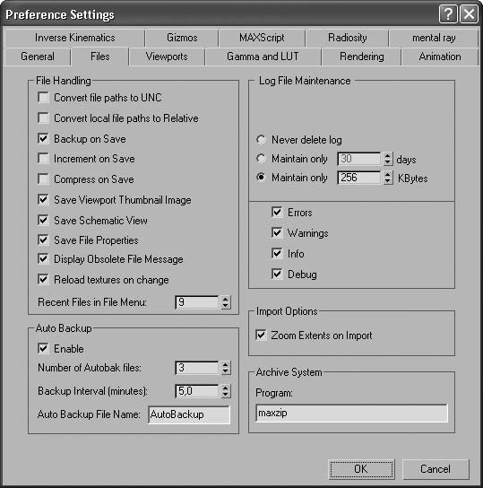 В появившемся окне Preference Settings (Настройки предпочтений) перейдите на вкладку Files (Файлы). В области Auto Backup (Автосохранение) (рис. 1.19) установленный флажок Enable (Включить) означает включение автосохранения. Счетчик Number of Autobak files (Количество сохраняемых файлов) определяет количество резервных копий, которые будут сохраняться, а счетчик Backup Interval (minutes) (Интервал между сохраняемыми копиями (в минутах)) – время, через которое они будут сохраняться. Текстовое поле Auto Backup File Name (Имя сохраняемых копий) служит для указания имени сохраняемых файлов.