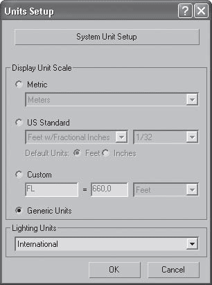 Все реальные предметы имеют определенные размеры и занимают определенную площадь. В связи с этим прежде чем начинать построение, следует определиться, в каких единицах измерения будем работать. Для назначения системы измерения выполните команду меню Customize → Units Setup (Настройки → Единицы измерения). Появится диалоговое окно Units Setup (Единицы измерения). В области Display Unit Scale (Отображение единиц масштаба) выберите один из предлагаемых вариантов: Metric (Метрические), U.S. Standard (Американская система стандартов), Custom (Пользовательские) или Generic Units (Условные единицы измерения), установив переключатель в соответствующее положение (рис. 2.1).