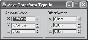Окно ввода значений трансформации состоит из двух областей. В области Absolute:World (Абсолютные: мировые) значения задаются в соответствии с мировой системой координат. В области Offset: Screen (смещение относительно экрана) учитывается экранная система координат. Мы будем рассматривать область Absolute:World (Абсолютные: мировые).