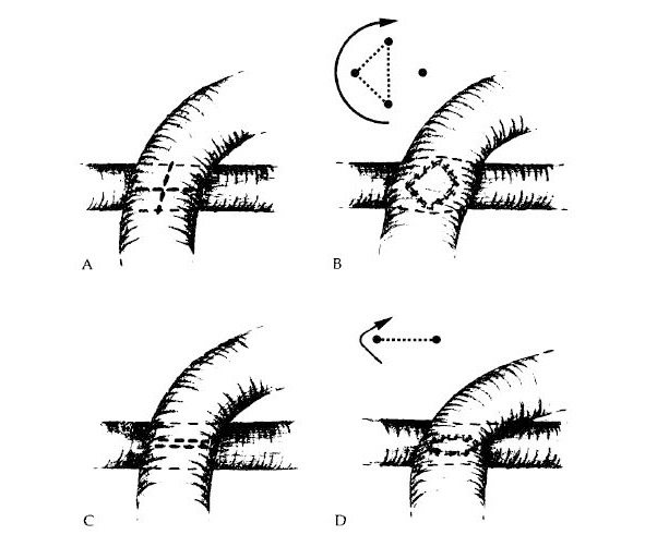 Рис. 15. Из описания техники выполнения анастомоза «бок в бок» по типу бриллиантовой грани Клодом Грондином (1977 год) следует, что для формирования ромбовидного анастомоза необходимо расположить аутовену и коронарную артерию перпендикулярно друг к другу. Венотомию необходимо выполнить перпендикулярно оси артерии (А), а шов наложить параллельно этой оси (В). Просвет анастомоза получается достаточно широким в сравнении с параллельной конфигурацией анастомоза (C, D).В таких анастомозах за счет трех точек фиксации (стрелка на рисунке В). Ann.Thorac.Surg. 1977; №.– 1; P: 1—8.