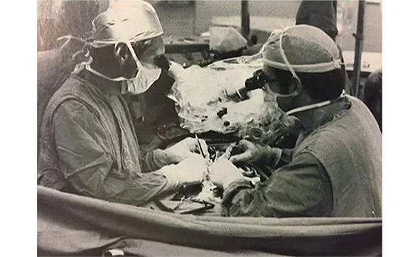 Рис. 16. Джордж Грин (слева) во время операции коронарного шунтирования с применением микрохирургической техники и операционного микроскопа (1971 г).