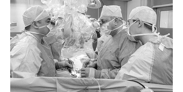 Рис. 17. Коронарное шунтирование с применением микрохирургической техники и операционного микроскопа (хирургическая бригада в составе Р. С. Акчурина, Д. М. Галяутдинова, М. Р. Османова).