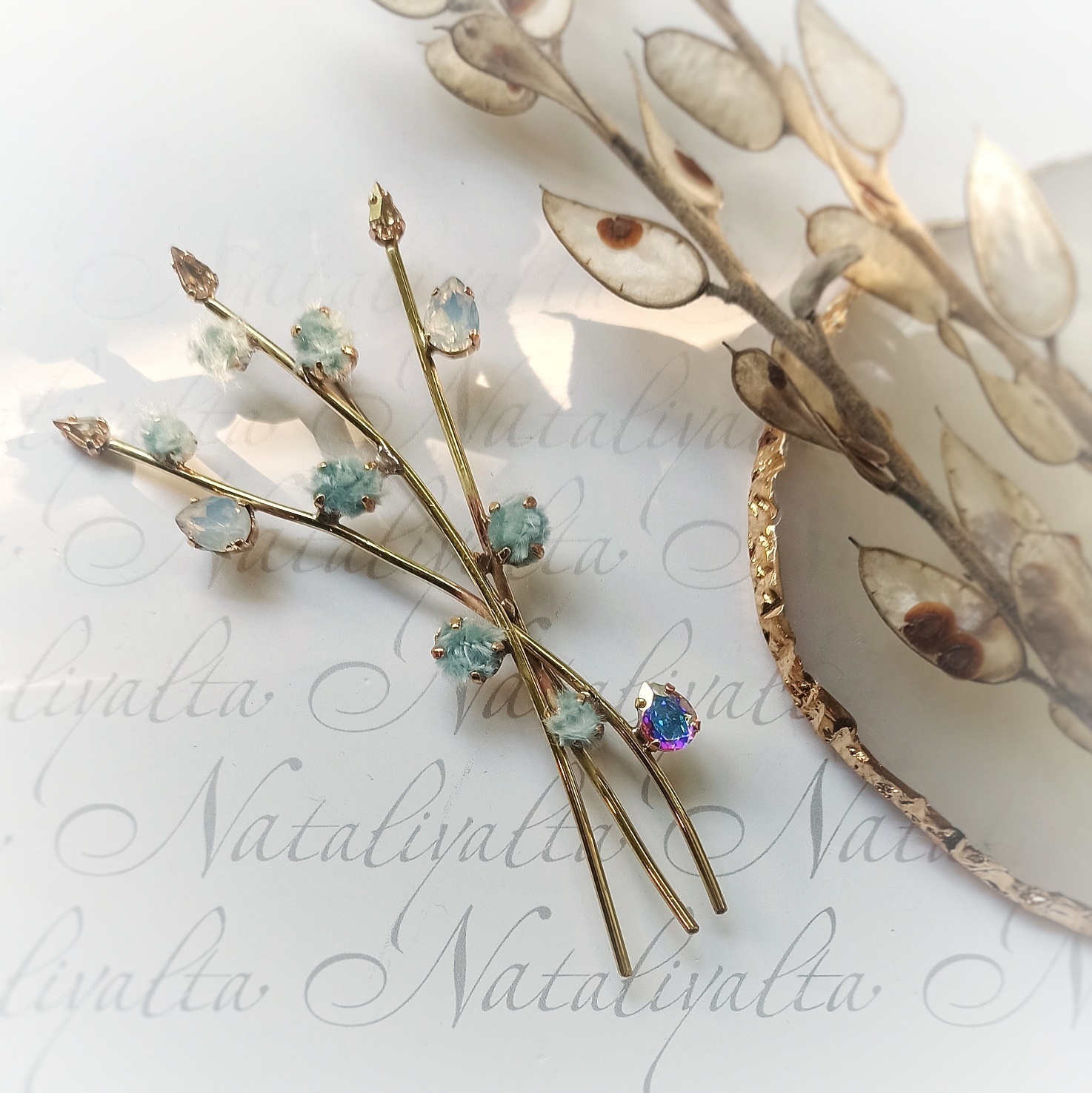 Симбиоз шёлка и огня родил изящную брошь «Верба», в состав которой пошли не только кристаллы, удивительно похожие на натуральные почки вербы, но и шёлк в виде нежных, как облако, пушинок синели.