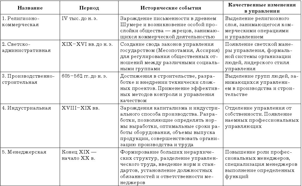 Это относится и к управленческой деятельности, которая также пережила в своей истории качественные перемены, называемые управленческими революциями[1], которых в современной теории менеджмента выделяют от пяти до двенадцати. Нами выделяются пять так называемых управленческих революций.