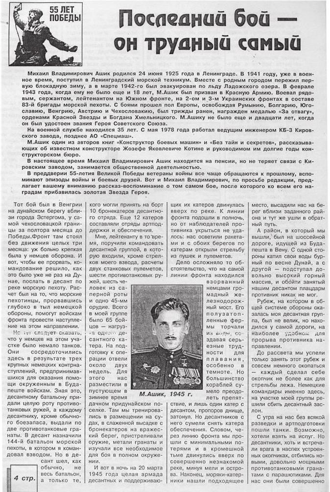 Примечательно, что в конце 1960-х годов появились первые литературные опыты Михаила Ашика. Однако «точить» свое перо он начал значительно раньше. Передо мной рукотворный сборник его очерков, статей и заметок с 1947-го по 2000 год. В нем множество статей с его воспоминаниями о войне, рассказы о боевых товарищах и, наконец, заинтересованное мнение о свершившихся в стране событиях, острая реакция на возникающие проблемы. В этом его твердая позиция гражданина своей великой страны. Представляет большой интерес география его печатных материалов и широкий спектр изданий. Здесь присутствуют его сочинения, опубликованные в газетах «На страже Ленинграда» (1947 год), «Боевой путь» (1950 год), «Защитник Родины» (1970 год), «Флаг Родины» (газета Краснознаменного Черноморского флота, 1974 год), «Керченский рабочий» (1992 год), в журналах «Нева», «Морской пехотинец» и многих других.