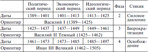 Вторая и третья фазы вместе составляют маскировочный период. Василий I и Василий II действительно «спрятались» между Дмитрием Донским и Иваном III, все лавры победы над чужеземным игом и становление Московского царства оставив им. Ни один Василий, ни другой не возглавляли военные походы. Если Москва подвергалась какому-нибудь нашествию, то они уезжали в спокойное место. Василий I возобновил выплату дани татарам и скромно занимался делами Северо-Восточной Руси, оставляя своему тестю, великому князю Витовту (см. главу «Тоталитарная Литва (1345–1489)»), вершить судьбы «Всея Руси». При Василии II Северо-Восточная Русь вообще погрязла в усобице. Образ слабой политики вводил в заблуждение всех. Однако за этой ширмой шли очень мощные процессы, династия была сохранена, единство было достигнуто, государственный интерес окреп и затмил все иные интересы, и при Иване III это дало замечательные плоды.