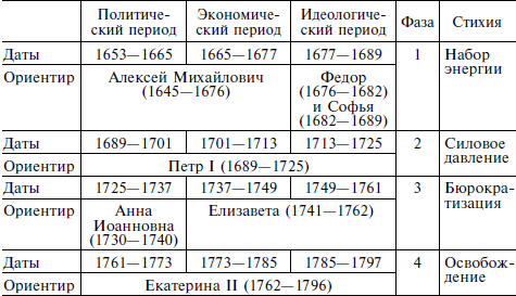 Первая фаза (1653–1689). До 1633 года страной правил Филарет. Сын его, Михаил Федорович, был фигурой малозначительной, умер в 49 лет, в 1645 году. При юном Алексее Михайловиче фактически управлял его воспитатель («дядька») боярин Борис Морозов. Именно его управление и вызывают «экономические» восстания, в 1648 году в Москве, в 1650 году в Пскове и Новгороде и так далее по всей стране.