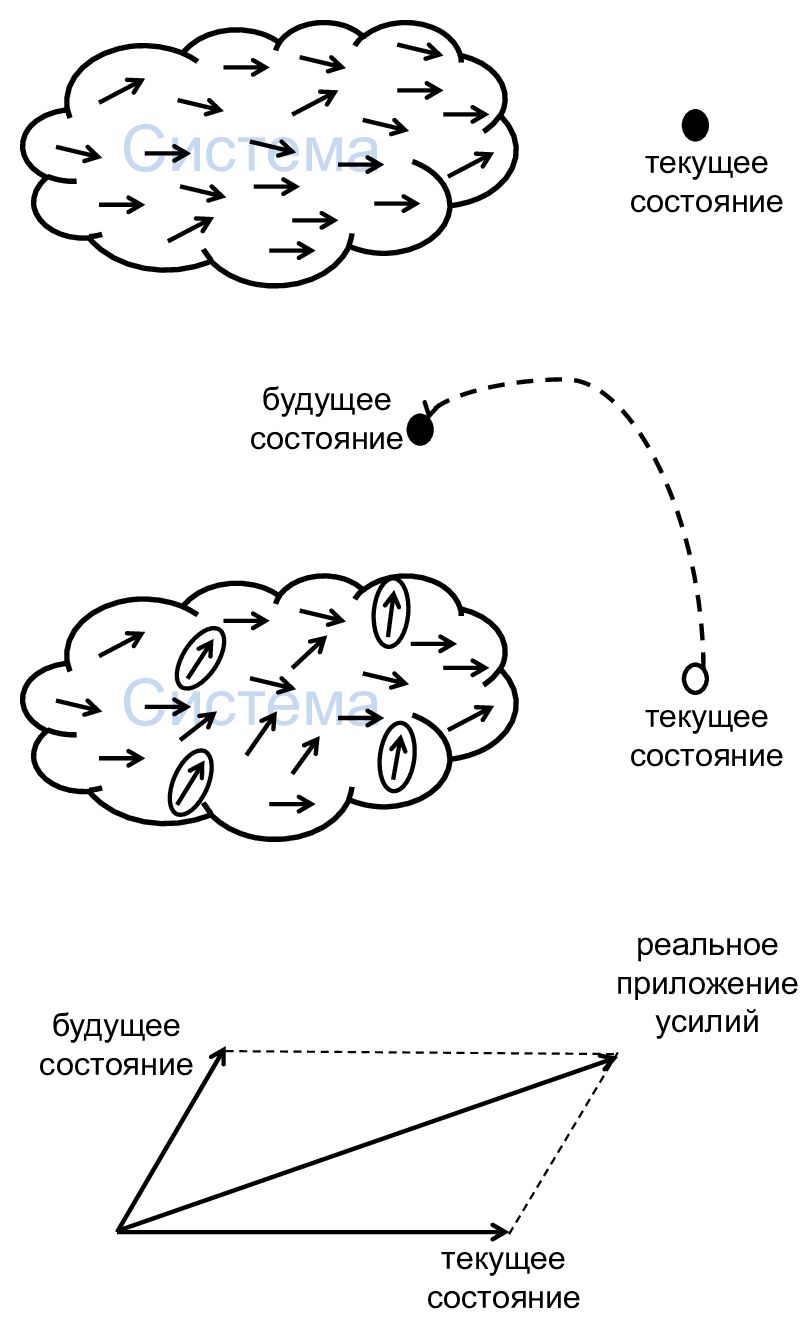 На модели видно, что фактическое новое направление можно вычислить по сумме усилий всех составляющих. Таким образом можно представить куда будет двигаться организация и как быстро она сможет перестроиться.