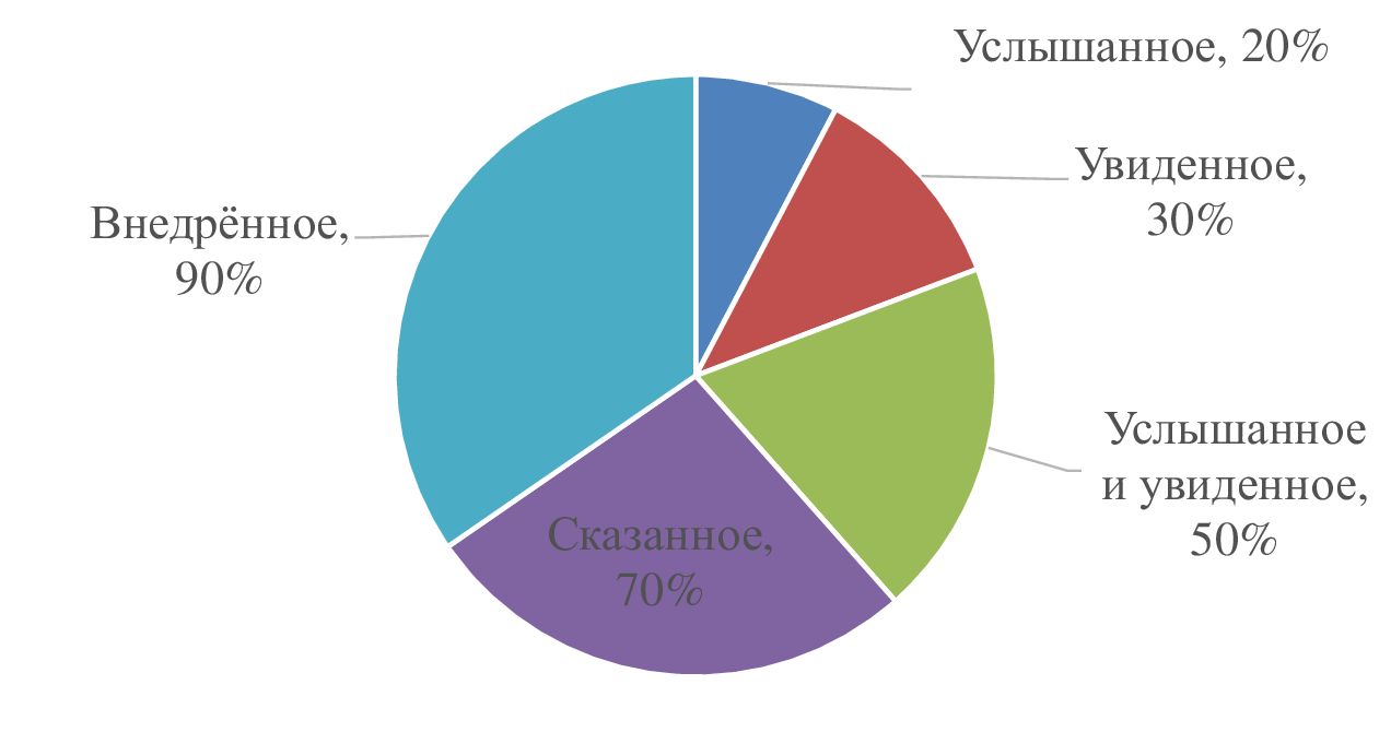 Человек запоминает 20% того, что он слышит, 30% того, что он видит, 50% того, что он одновременно слышит и видит, 70% того, что он говорит и 90% того, что он внедряет.