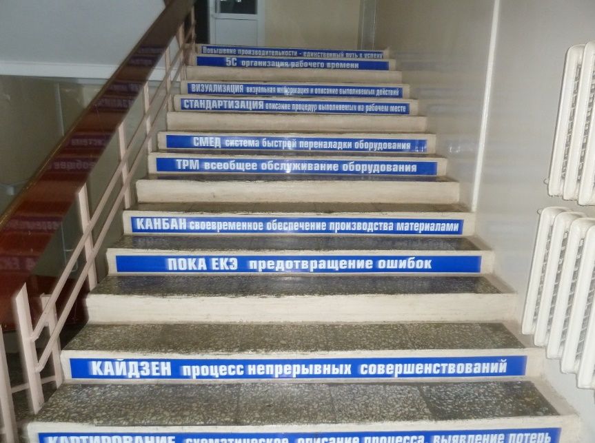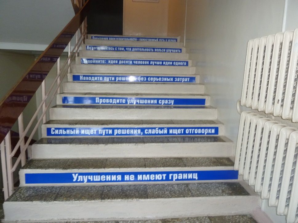 На фотографиях ниже представлены примеры наглядной агитации и формирования бережливой терминологии. С точки зрения использования мета и пространства – это очень хороший вариант. Наверняка по лестницам ходит большое количество работников. Главное, чтобы там ходила именно целевая аудитория. С моей точки зрения, излишнее использование терминов может вызвать отторжение, но порой оно бывает полезно, особенно на первых этапах развития организации, чтобы устоялась определенная терминология. Если человек начинает употреблять терминологию, он постепенно начинает задумываться, что это такое, узнавать значение и применять его в работе.