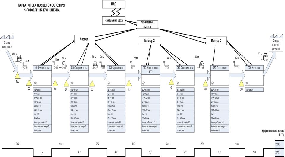 Самые распространённые примеры визуализации аналитической информации – это конечно карты потока создания ценности (КПСЦ) и карты процесса. Первые визуально отображают материальный поток по мере преобразования продукта от сырья (заготовки) до готового конечного продукта (см. рисунок ниже).
