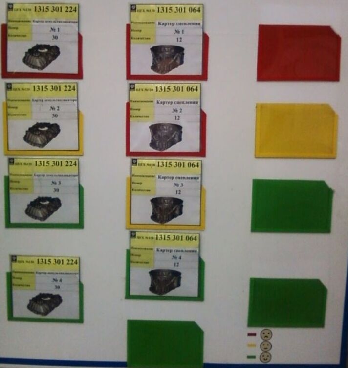 Следующие примеры также демонстрируют элементы вытягивания. На следующем ярком рисунке изображён стенд канбан заготовок картеров. Не смотря на название, это не совсем стенд канбан, т.к. в данном случае не выполняется рад важных условий. Однако этот примитивный инструмент выполняет поддерживающую функцию для системы вытягивания. Стенд работает между двух операций, которые находятся в разных цехах и регулирует производство и поставку заготовок картеров.