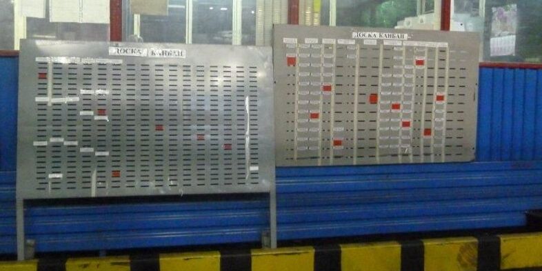 В данном примере, доска находилась на складе, откуда по системе канбан поставлялся ряд заготовок (не все, а только несколько самых ходовых видов). Доска имеет множество ячеек, в которых располагаются Т-образные канбан-карточки. Т-образная форма помогает карточке хорошо держаться в ячейке и быть видимой всем. Карточки путешествуют вместе с заготовками в тарах.