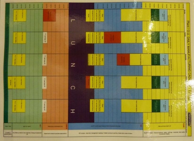 Распорядок содержит определённые постоянно повторяющиеся работы и синхронизирует их между руководителями разного уровня. Например, в определённое время проводится совещание на информационном центре, в определённые дни там же проводятся тематические совещания (безопасность, качество и т.д.). Визуализация стандартного рабочего распорядка позволяет всем иметь представление о работе в едином ритме. Руководители знают в какое время и по каким темам они должны готовиться и подходить с вопросами и предложениями. Такая работа позволяет избежать траты времени на авральных и неэффективных совещаниях.