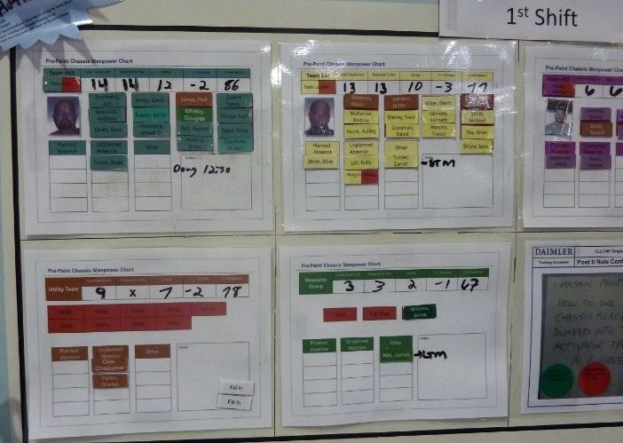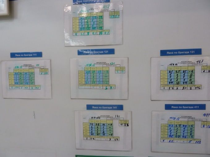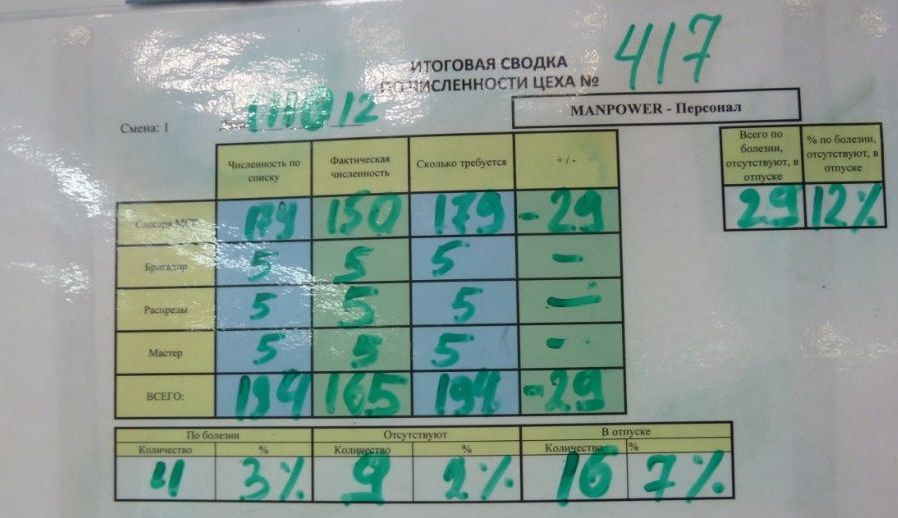Суть работы доски проще, чем можно подумать, глядя на рисунок. Линия, для которой была создана доска работала в две смены и была поделена на бригады. В верхней половине доски два уровня вертикальных столбцов отражают необходимую численность и расстановку персонала в бригаде. Уровень выше – это первая смена, уровень ниже – вторая смена. В каждой бригаде должны выполняться определённые стандартные работы, для чего должна быть обеспечена определённая численность персонала. Каждый столбик поделён на прямоугольники, в которых отражено название соответствующих операций, выполняемых в бригаде. Все эти прямоугольники должны быть закрыты людьми: операторами. Зелёные прямоугольники – это магниты с фамилиями операторов. В идеальном варианте весь столбец в бригаде должен быть зелёным: все операции должны быть закрыты людьми. Как вы видите, во многих операциях не хватает людей (они не закрыты зелёными магнитами). Именно поэтому была создана эта доска. Мастера или бригадиры с утра отмечали явку персонала и расставляли людей, чтобы закрыть все операции. Т.к. этого сделать часто не удавалось, здесь же принимались решения о привлечении работников со стороны (например, из других цехов). Их ставили на менее ответственные операции и их магниты были синие. Кроме этого могли приниматься решении об изменении номенклатуры, например, когда совсем мало ресурсов – делали то, что проще. Информация на доске давала полное представление о главном в данном процессе ресурсе – о персонале. Высвобожденные бригадиры имели жёлтые магниты, им часто приходилось заменять отсутствующих работников. Также, вы можете увидеть, что некоторые работники выполняли по две операции (магнит закрывает два прямоугольника).