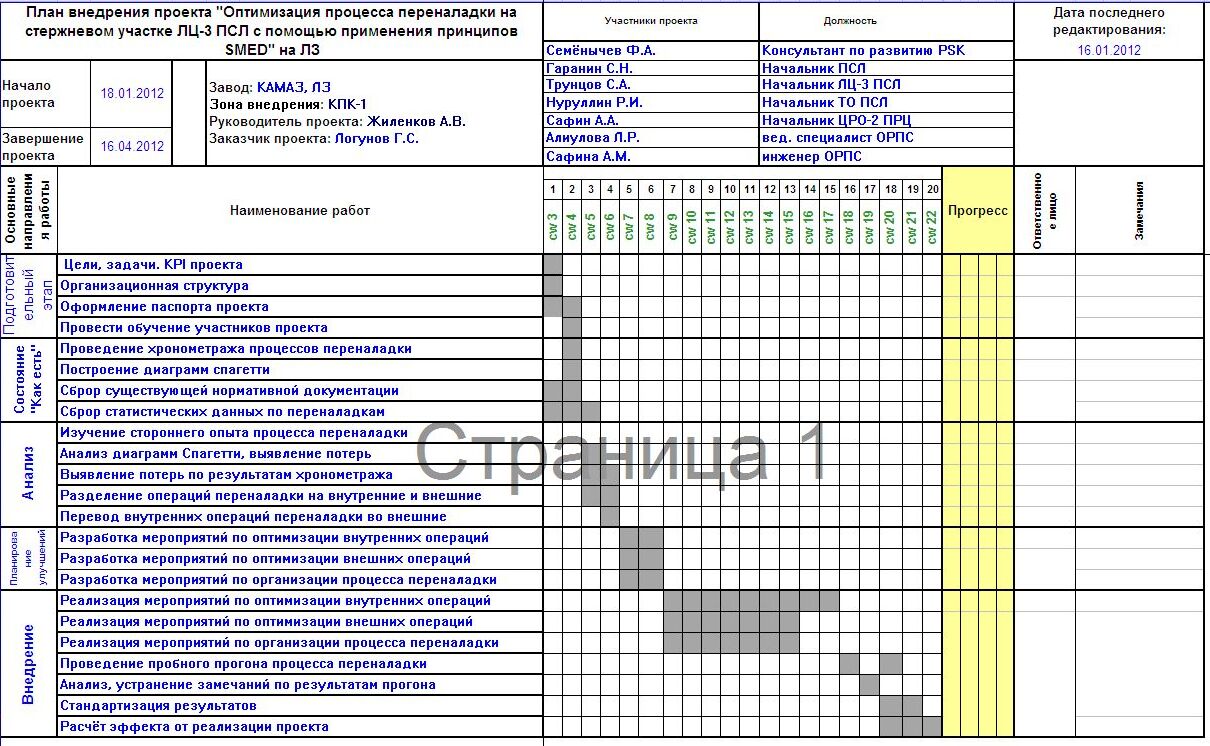 Следующий пример – визуализированная форма тактического плана реализации определённых работ. Такие формы плана часто размещают на информационном центре (например, план работ цеха на год), в проектных комнатах (например, план реализации проекта) или в любом месте реализации работ. Подробней о структуре, подходах к разработке таких планов, а также о правилах работы с ними вы можете прочитать в книге «Реализация стратегии по принципу «Заказчик – Поставщик».