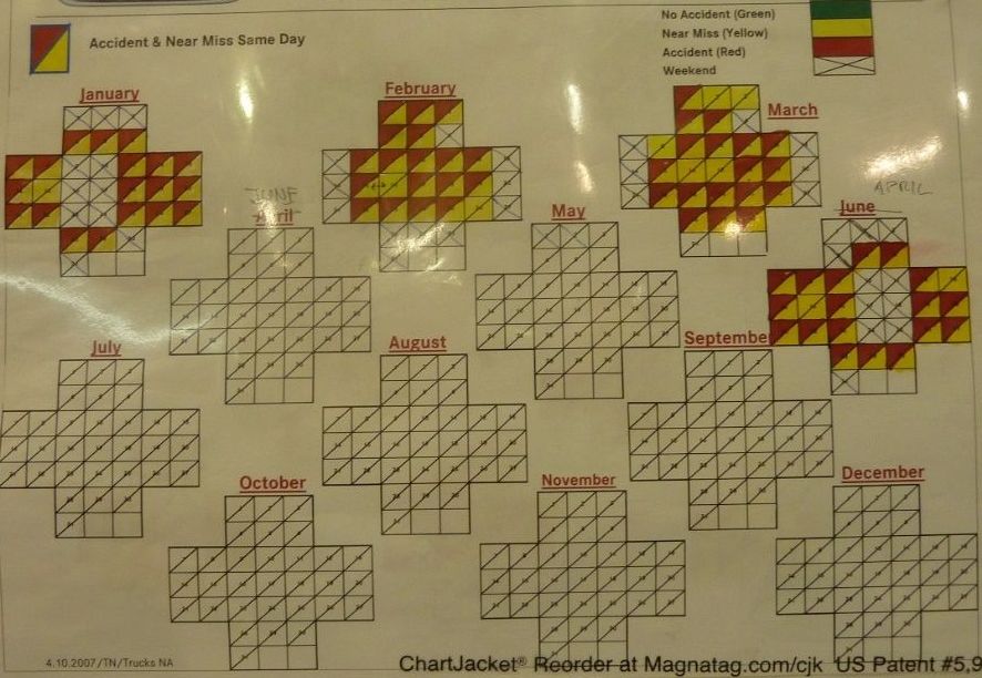 Согласно законам статистики, ликвидируя травмоопасные ситуации, исключается риски появления несчастных случаев. В данном случае, ведётся так называемая работа на опережение. При наличии травмоопасных ситуаций один квадратик креста, соответствующий календарному дню, закрашивался в жёлтый цвет. Если работа проходила в две смены – закрашивалась половина. Зелёный цвет означает, что травмоопасных ситуаций не выявлено, что подозрительно, т.к. травмоопасные ситуации всегда можно найти. Красный цвет означает день с несчастным случаем. Это наиболее распространённая цветовая маркировка.