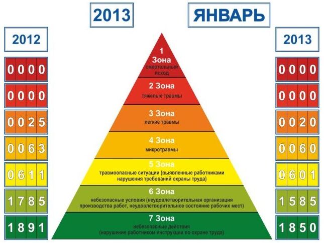 На втором рисунке приведён пример ведения детализированной статистики по травмоопасным ситуациям, несчастным случаям и даже факторам риска. Это реальный пример информации, которая размещалась перед входом на завод, аналогично с днями без травм. Она также показывала о ведущейся работе в направлении безопасности.