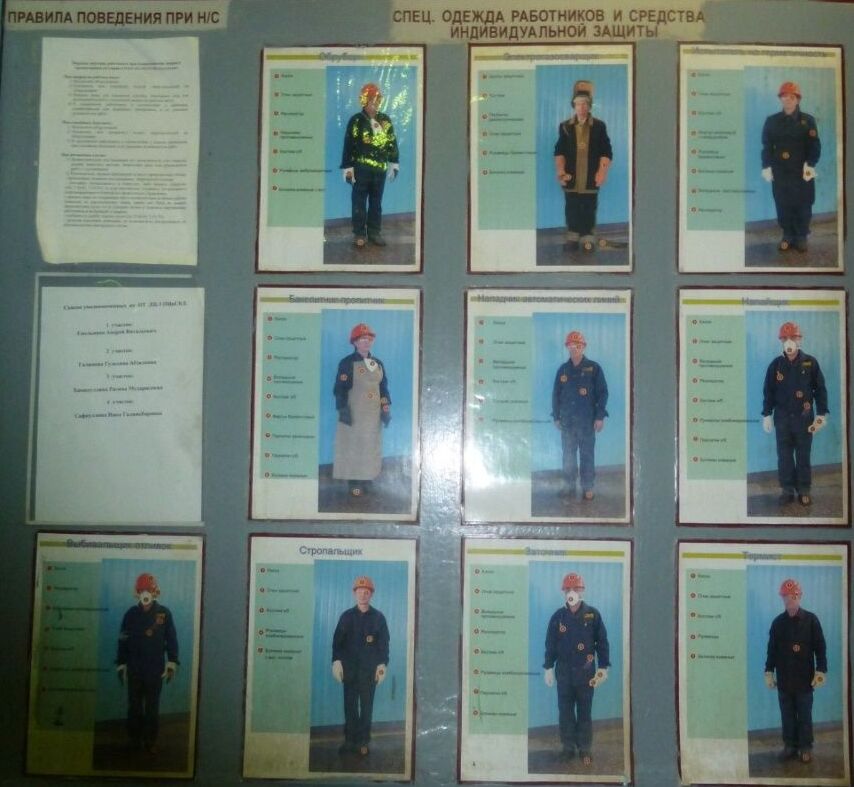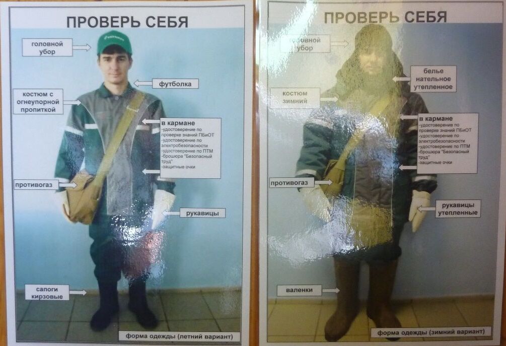Следующие примеры можно назвать «Проверь себя». Это фото правильно и полностью экипированного рабочего, по котором можно сразу выявить несоответствие. Такие фото часто размещают в раздевалках, особенно перед выходами в производство. Также рядом часто размещают зеркало, чтобы работник, проходя мимо, глядя на себя и на фото (хороший тон – фото в полный рост) сам обнаружил несоответствие. Таким образом исключается риск того, что рабочий забудет надеть какое-либо средство индивидуальной защиты.