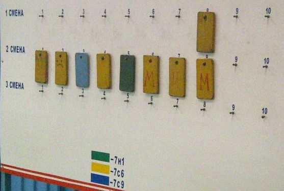 На доске напротив номера соответствующей стержневой машины, инженер планово-диспетчерского отдела каждое утро записывает задание на изготовление определённой номенклатуры стержней (какие стержневые ящики на какие машины устанавливать), старший мастер участка устанавливает магниты с фамилиями наладчиков напротив соответствующих машин в соответствующее время, когда должна происходить переналадка.