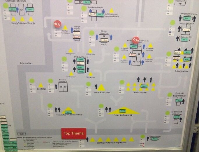 Следующий пример взят из одной из западных компаний. В данном случае визуализирована планировка участка. Если обратить внимание, то она схематично показывает движение продукта (снизу-вверх). Данный вид не очень привычен нашему глазу, т.к. мы привыкли представлять планировку в виде чертежа, выполненного в определённом стиле. Тем не менее, с помощью данной доски контролируется расстановка персонала. Вы можете видеть несколько зелёных и белых магнитиков, которые расставляются на «рабочие места», т.к. на места планировки, где изображены фигурки человека. Таким образом происходит расстановка персонала. Выше мы описывали более сложный пример расстановки персонала, принцип здесь аналогичный.