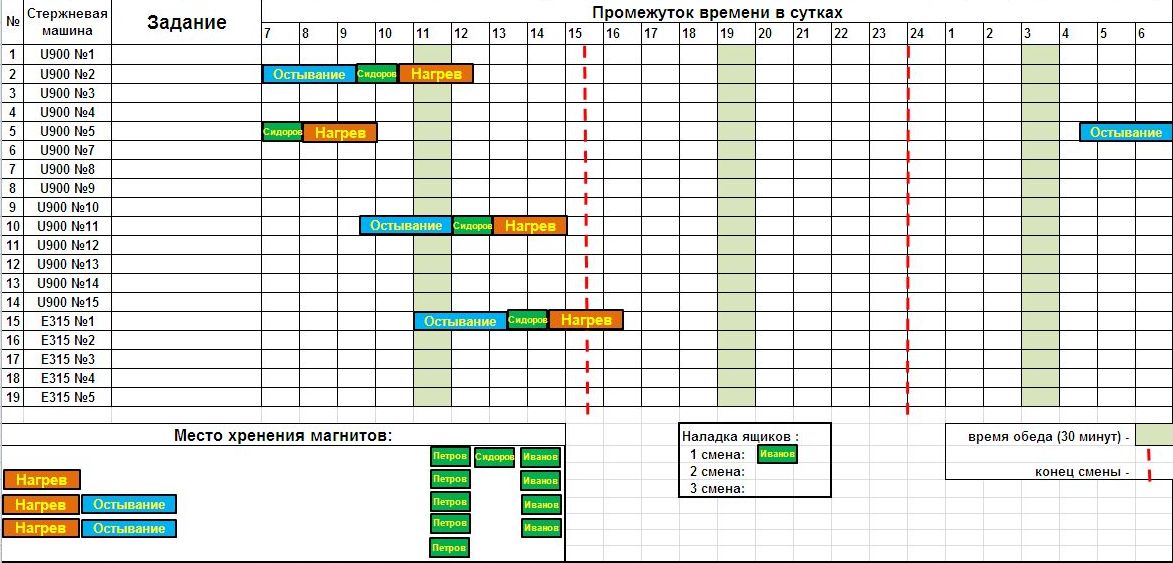 Синий магнит «остывание» кроме мастера имеет право ставить оператор, остановивший машину. Зелёный магнит – с фамилией наладчика – указывает на каких машинах в какое время необходимо готовить переналадку. Оранжевый магнит «нагрев» показывает во сколько оператору, закреплённому за определённой машиной, нужно начинать на ней работу. Длина всех магнитов пропорциональна реальному времени в масштабе шкалы сверху.