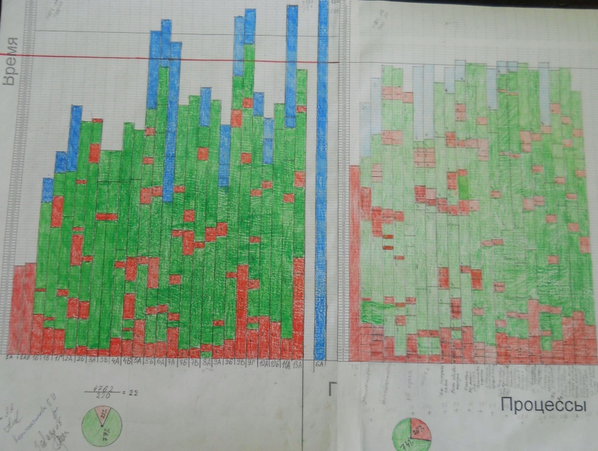 Первая фотография представляет диаграмму Ямадзуми в качестве примера наглядной аналитики. Её можно отнести в иной раздел настоящей книги. В данном случае с помощью диаграммы устранены потери и выровнена загрузка персонала в бригаде. Подробнее о работе с этим методом вы можете узнать из видеокурса «Выравнивание загрузки при помощи перебалансировки операций» или из тренинга «Выравнивание загрузки».