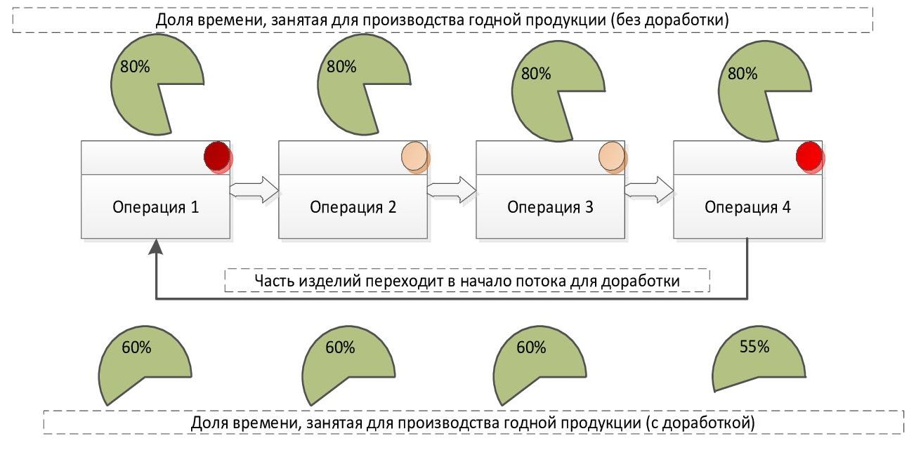 Диаграммы, расположенные в нижней части, отражают долю времени, занятые для производства годной продукции при условии её повторной доработки. После обнаружения брака на операции №4, доля продукции передаётся туда, где был заложен брак: на операцию№1. После доработки на операции №1, доработанный продукт снова попадает в поток. Тем не менее из 80% продуктивного времени остаётся уже 60%, т.к. 20% было потрачено на доработку. Последующие операции во время доработки ожидают продукт, и доля их продуктивного времени также не будет превышать 60%. Если пристальней посмотреть на операцию, являющуюся местом возникновения дефекта, можно увидеть, что доля продуктивного времени в ней будет ещё ниже. Это происходит потому, что обнаруженный брак не просто нужно выявить, но и отсортировать и отправить на доработку, что требует дополнительного времени. Таким образом, скорость потока серьёзно уменьшается, а время исполнения заказа увеличивается.
