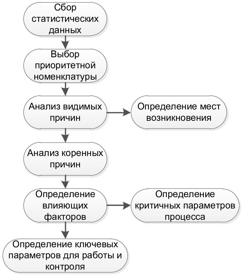 Следующий шаг алгоритма – это анализ видимых причин возникновения дефектов, за которым следует шаг анализа коренных причин возникновения дефектов. Как правило, наиболее браконосная номенклатура имеет не так много разных видов дефектов. Можно выделить 1-2 вида дефекта, с которыми следует продолжить работу. Встречаются ситуации, когда сложно выделить 1-2 постоянно повторяющихся дефекта, что говорит о серьёзной нестабильности. В любом случае, каждый продукт и дефект стоит рассматривать поочерёдно и последовательно, это и есть совершенствование.