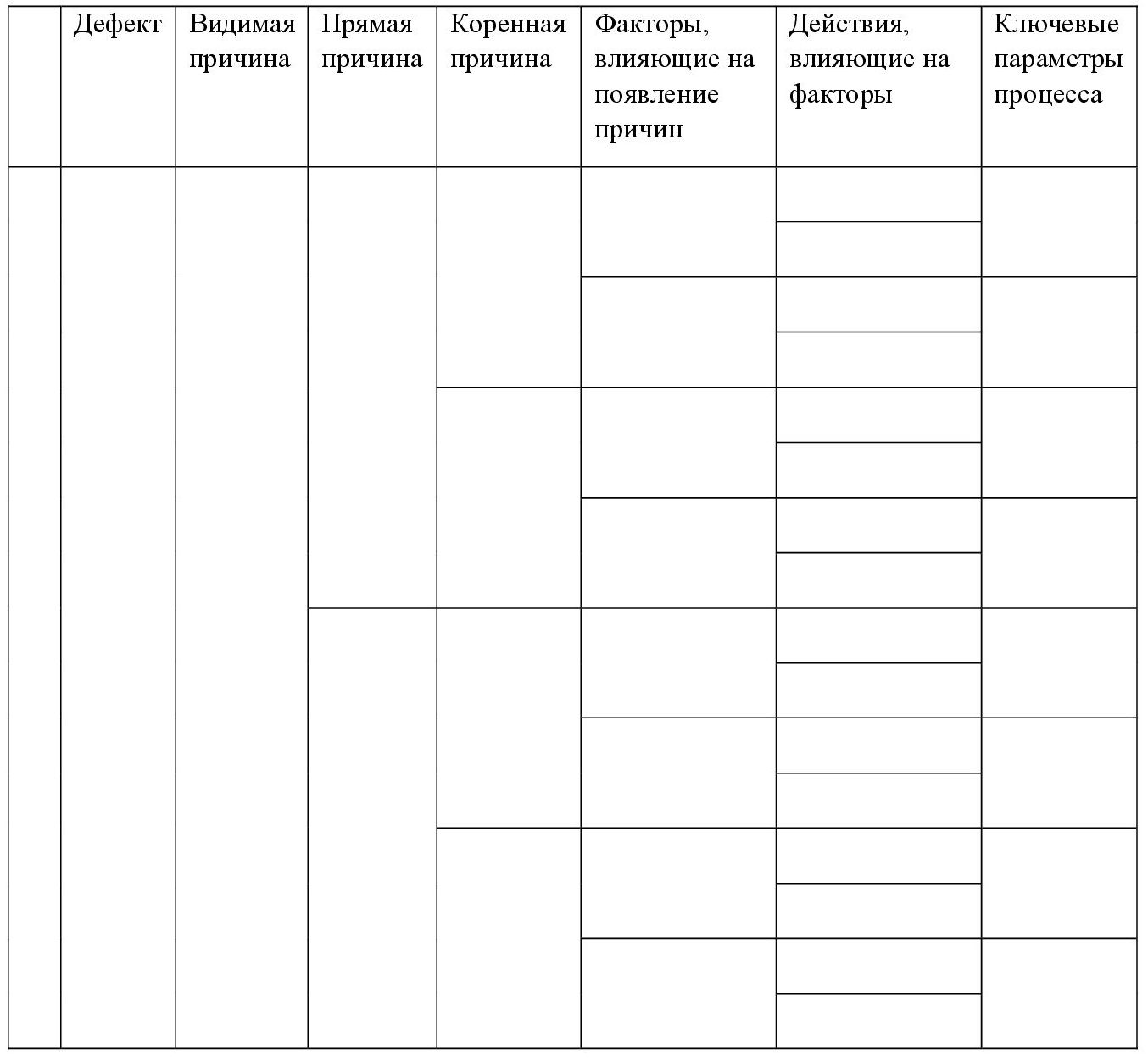 Это всего лишь небольшой пример таблицы, призванный показать последовательность анализа, а также всю его серьёзность. Согласно примеру, для определённого дефекта определяется его место возникновения и видимая причина. Мы понимаем, что на практике таких мест и причин может быть больше одной, здесь, чтобы не загромождать таблицу, мы взяли одну. Далее определяются вероятные первопричины, которых может быть также несколько, затем коренные причины.