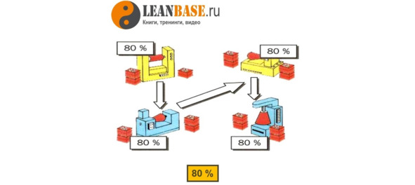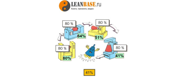 Обратите внимание на рисунок. Эффективность каждой единицы оборудования осталась прежней: 80%. Зато эффективность отдельных частей этого потока постепенно уменьшается. Так, уже после второго станка эффективность падает до 0,8х0,8=0,64 или 64%.