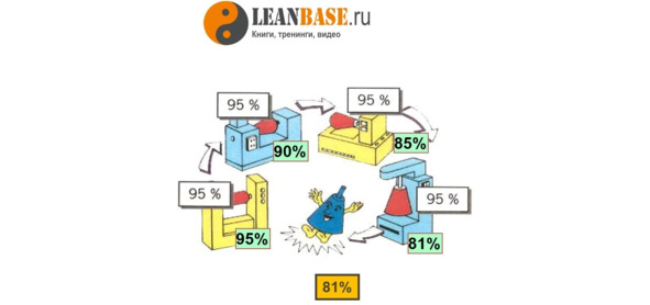 Например, если рассмотреть только одну составляющую эффективности, такую, как качество, то можно увидеть, что при 90% качестве на каждой единице оборудования, качество потока будет гораздо меньше этой величины. Например, если два станка работают последовательно и выдают 90% качественного продукта каждый, то после второго станка выходит уже 0,9х0,9=0,81 или 81% качественного продукта по отношению к тому объёму, который вошёл в поток в начале. Если три станка работают с аналогичной долей годной продукции, то на выходе потока выйдет только 0,9х0,9х0,9=0,729 или 72,9% годной продукции, т.к. на каждую операцию её поступает на 10% меньше.