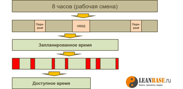 Что фактически происходит с запланированным временем – мы знаем: оборудование останавливается по разным причинам (см. потери в работе оборудования). Это могут быть поломки, организационные недоработки и многое другое. В результате чего на рисунке мы видим красные полосы, символизирующие простой операции или оборудования. Всё, что остаётся – это доступное для работы время.
