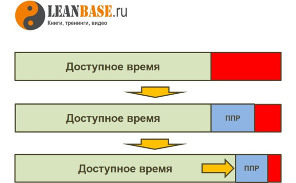 Графически эта переходная ситуация представлена на рисунке. Следующими шагами по улучшению будет являться сокращение времени выполнения плановых работ за счёт оптимизации их составляющих и устранения потерь внутри. Кроме того, должна продолжаться работа по сокращению незапланированных простоев, путём их перевода в плановые работы. Таким образом, увеличивается доступное для работы время.